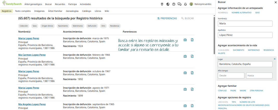 En el menú principal, entra en la sección “Buscar” → “Registros”. Allí podrás introducir el nombre de tu antepasado, el lugar y un rango de años. FamilySearch mostrará partidas sacramentales, censos y otros documentos relacionados.