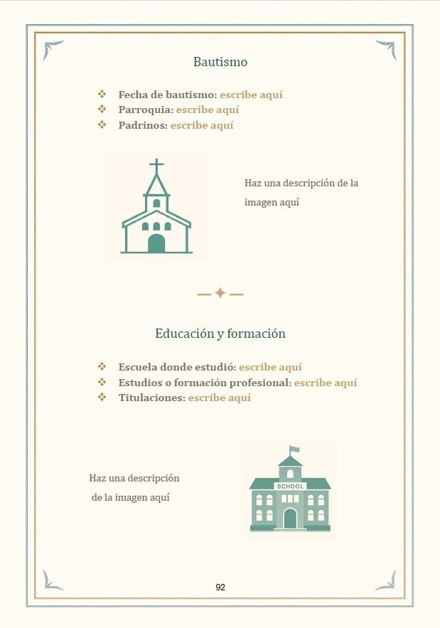 Solo tienes que abrir el archivo en Word y rellenar los apartados: escribir, pegar fotografías y completar la información de tus antepasados. El libro está diseñado con un estilo limpio, elegante y ligero para que puedas imprimirlo o guardarlo como archivo digital.